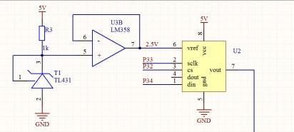 在给TLC输入2.5V参考电压的时候,我们用了TL431芯片。TL431是可控精密稳压源。它的输出电压用两个电阻就可以任意的设置到从Verf(2.5V)到36V范围内的任何值。该器件的典型动态阻抗为0.2Ω,在很多应用中用它代替稳压二极管。