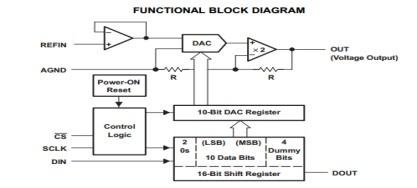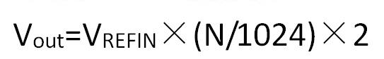 Vout为7脚输出电压,Vrefin为6脚参考电压输入端,N为单片机通过1、2、3管脚向TLC5615写入的数据,1024是根据这是一片10位数模转换而计算出来的(210=1024),最后乘以二是因为TLC5615内部有2倍的增益放大器。