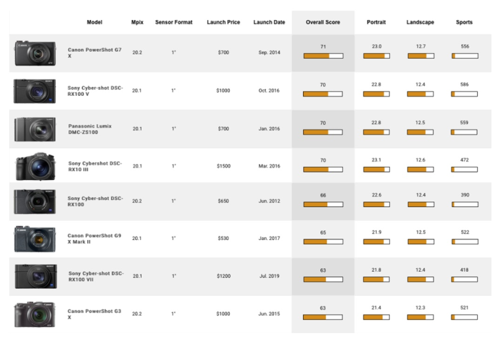 在DxOMark的数据库中,与RX100 VII最相近的竞争对手是松下Lumix DMC-ZS100。它于2016年推出,机身极具现代风格,时尚紧凑,拥有2000万像素1英寸BSI-CMOS(与早期的索尼RX100 V相似,同样没有PD-AF像素)和高端的莱卡认证的25-250mm等效F2.8-5.9变焦装置。DxOMark还纳入了数据库中佳能品牌最接近的型号,即2015年面世的PowerShot G3 X。这款相机也拥有2000万像素的1英寸BSI-CMOS,但它有强大的24-600mm F2.8-5.6变焦。