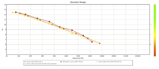 在大多数情况下,佳能G3 X动态范围表现与索尼RX100 IV相似,但前者在每一处设置所测得的感光度值略高。这将使索尼RX100 VII(和松下ZS100)在拍摄高对比度的场景时具有轻微的优势,比如拍摄同时具有较深阴影和高光的风景或室内。尽管在大多数情况下,它们的性能差别不大。