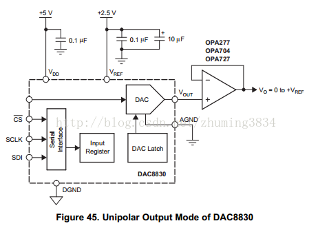 实际电路是按照DAC8830数据手册的典型应用电路做的。