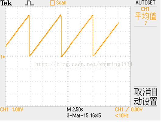 通过示波器测试出DAC8830的输出脚,波形如图: