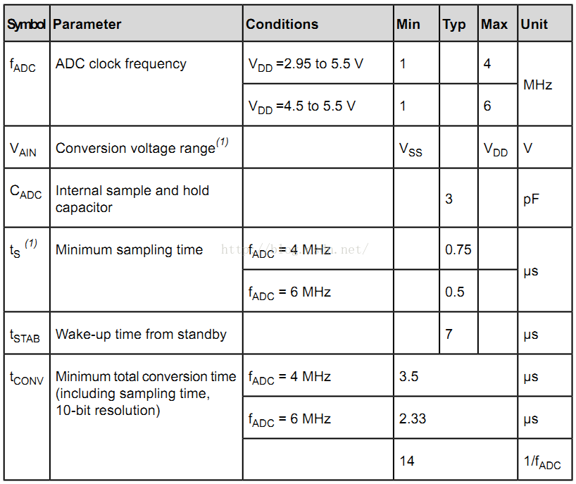 根据《数据手册》我们知道,10位ADC特性如下(除另有规定外,VDD、fMASTER、TA都受一般操作条件的限制):