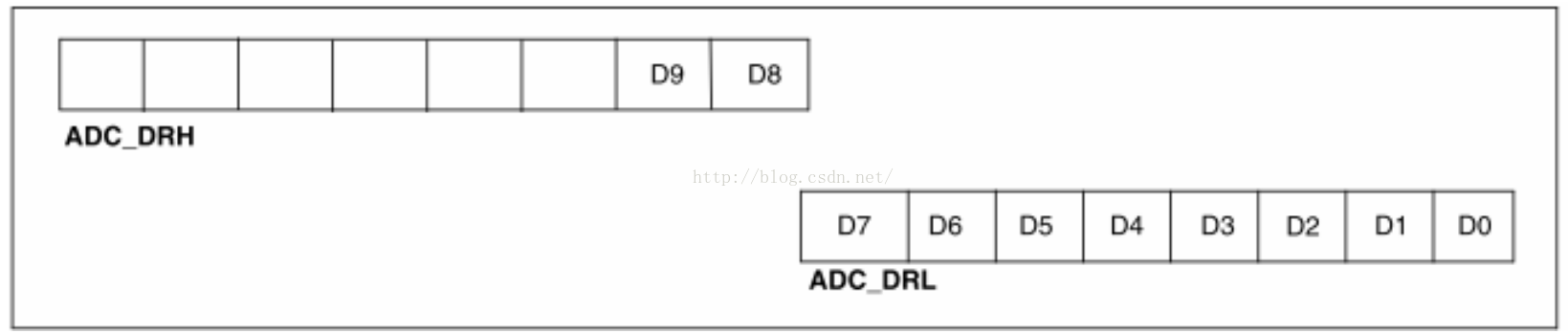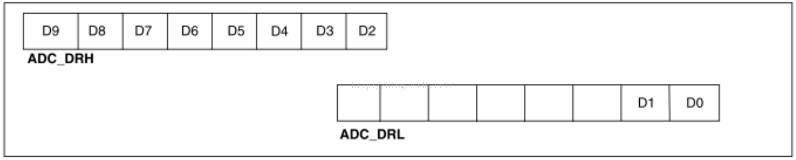 左对齐:8个高位数据被写入ADC_DH寄存器中,其余的低位数据被写入ADC_DL寄存器中。读取时必须先读高位再读低位。