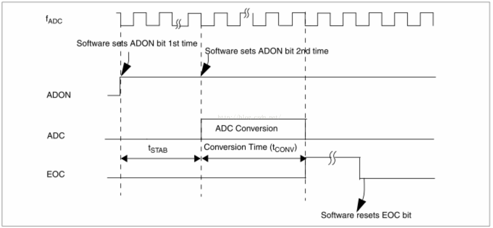 如 图149所示,在ADC上电后,在开始精确转换之前ADC需要一个稳定时间tSTAB (等于一次转换的时间 tCONV),对于之后接下来的转换就不需要稳定延时,而且ADON位只需要被置位一次。一次ADC转换需要14个时钟周期,在转换完成后EOC标志被置位,同时转换结果保存在10位ADC数据寄存器里面。
