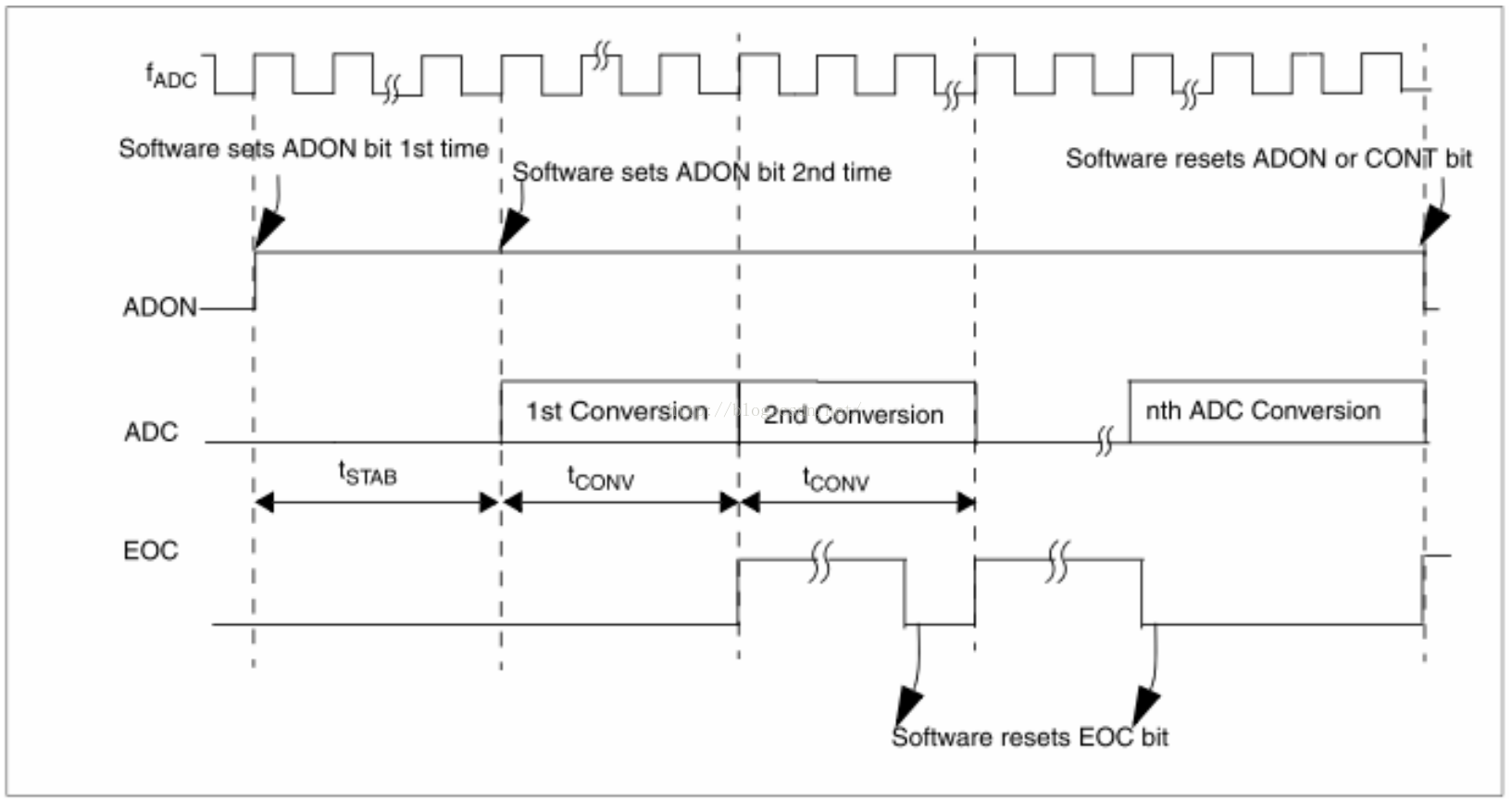 如果要停止连续转换,可以复位清零CONT位来停止转换或者复位清零ADON位来关闭ADC的电源。