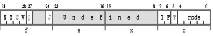 当前程序状态寄存器CPSR可以在任何位处理器模式下被访问,它包含条件码标志、中断控制、当前处理器模式以及其他状态和控制信息。CPSR的结构图如下: