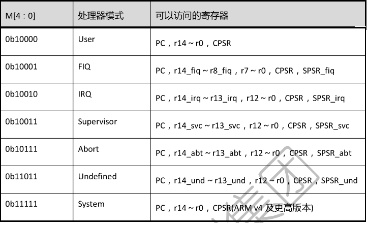 M[4:0]为模式控制位,这些为的组合确定了处理器处于哪种状态。下表给出了各个模式对应的M值: