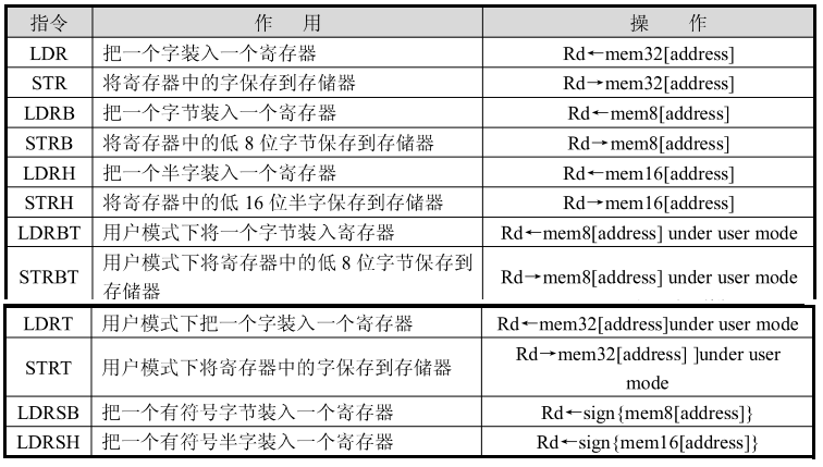 根据 1.2、语法格式 LDR{ 1.3、参数说明 2、STR指令 2.1、作用 将一个32位的字数据写入到指令中指定的内存单元 2.2、语法格式 STR{ 二、字节数据传送指令(LDRB/STRB) 1、LDRB指令 1.1、作用 根据 1.2、语法格式 LDR{ 2、STRB指令 2.1、作用 从寄存器中取出指定的8位字节放入指令中指定的内存单元的低8位,并将其高位补0 2.2、语法格式 STR{ 三、半字数据传送指令(LDRH/STRH) 1、LDRH 1.1、作用 从内存中将一个16位的半字读取到目标寄存器 1.2、语法格式 LDR{ 2、STRH 2.1、作用 从寄存器中取出知道你个的16位半字放入指令中指定的内存单元的低16位,并将其高位补0 2.2、语法格式 STR{ 四、用户模式字数据传送指令 1、LDRT 1.1、作用 在用户模式下,根据 1.2、语法格式 LDR{ 1.3、参数说明 2、STRT 2.1、作用 将一个32位的字数据写入到指令中指定的内存单元 2.2、语法格式 STR{ 五、用户模式字节数据传送指令 1、LDRBT指令 1.1、作用 根据 1.2、语法格式 LDR{ 2、STRBT指令 2.1、作用 将一个8位的字节数据写入到指令中指定的内存单元 2.2、语法格式 STR{ 六、有符号的字节/半字数据传送指令 1、LDRSB指令 1.1、作用 根据 1.2、语法格式 LDR{ 2、LDRSH指令 2.1、作用 根据 2.2、语法格式 LDR{
