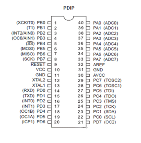 ATmega16L单片机采用了增强性的AVRRISC结构,具有低功耗、高性能的8位CMOS微控制器。其内具有先进的指令集还有单时钟周期指令执行时间,加快了CPU的运行速度,ATmega16L的数据吞吐率可高达1MIPS/MHz,因此可以极好的处理系统在功耗和处理速度方面的矛盾。目前 ATmega16L有多种封装形式,本设计采用了PDIP封装形式,其引脚图如图2所示。