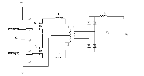 推挽电路的工作原理是:当PWM控制信号输入Q1的栅极时,Q1开始工作处于导通状态,因此Vin加在了隔离变压器初级线圈的1端;同理当PWM控制信号输入Q2的栅极时,Q2开始工作处于导通状态,因此Vin加在了隔离变压器初级线圈的2端,其中1、2两端需接入两个33μH的电感。由于两路PWM信号相位互补,所以Q1、Q2交替导通,这样在隔离变压器的初级就产生了交流电压信号。