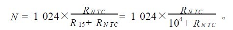 电池温度通过负温度系数电阻R15测量,其阻值在25℃时近似为10k8。NTC为分压器的一部分,由参考电压(AREF,3.3V)供电。由图2可得到: