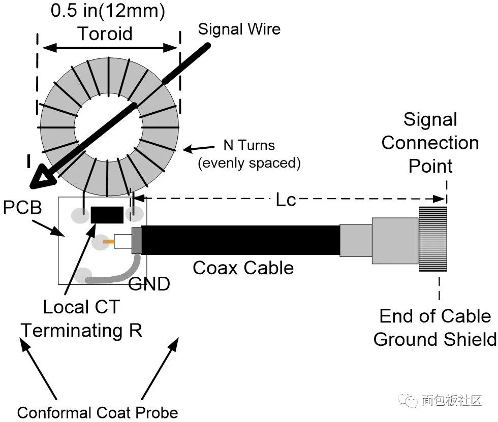 图2所示的电流探头使用SMD电阻,这就是为什么需要一个小PCB来安装它并固定到同轴电缆的末端。务必保形涂覆整个电流互感器组件;绕组非常脆弱,同轴电缆会给电流探头带来很大的机械应力。