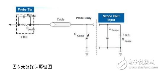 图3所示为日常最为常见的一类无源探头原理示意图,它由输入阻抗Rprobe、寄生电容Cprobe、传输导线(一般1至1.5米左右)、可调补偿电容Ccomp组成。此类无源探头一般输入阻抗为10MΩ,衰减比因子为10:1。