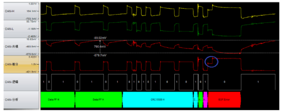 方法二:根据特征电平判断错误原因。从波形上对通信错误的诊断往往是最直接、高效的,但这依赖丰富的现场经验,笔者此处列举几个CAN波形案例供参考。