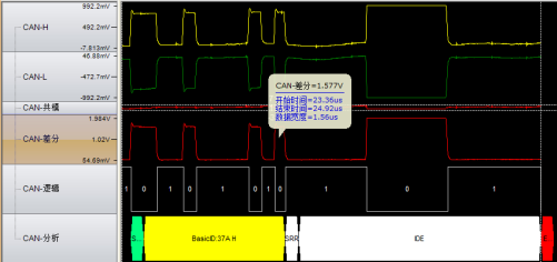 图6波特率异常(位宽度从2us突然变成1.6us),导致位错误引起错误帧。位宽的不稳定是波特率不稳定导致的,最有可能的原因是晶振问题,建议更换晶振测试。