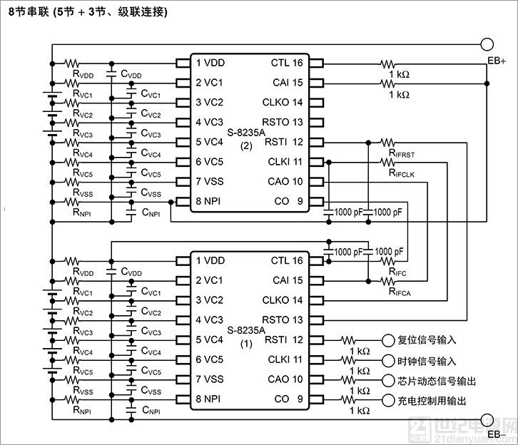 S-8235A系列通过级联连接,可以监视6节以上的串联连接的锂离子二次电池。将复位信号和时钟信号输入到最下段的S-8235A系列,便可自测试级联连接的所有S-8235A系列。