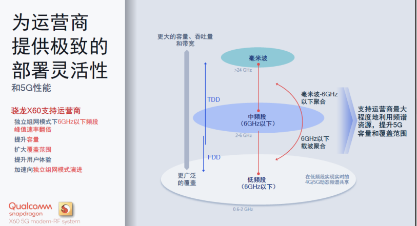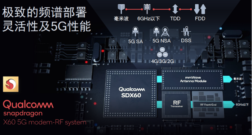 骁龙X60成为全球首款支持毫米波- 6GHz以下聚合的5G调制解调器及射频系统,它能够为运营商提供全面丰富的选择,帮助运营商最大程度地利用频谱资源,以兼顾实现最优网络容量及覆盖。