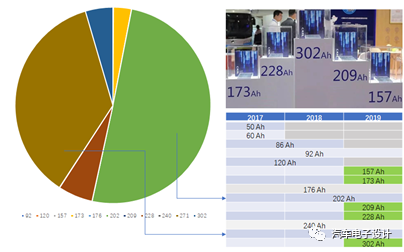 CATL 原本的商用车的电芯容量从 50Ah,一路提升到 157Ah 起步,2019 年宁德时代的商用车用的最多的是 202Ah 和 271Ah,而在去年 11 月的北京公交展览上新的电芯规格主要是在厚度上做一些差异化,形成了新的一组优选的电芯容量。