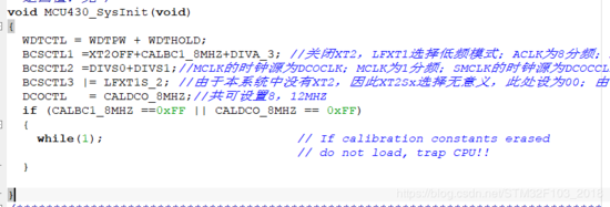 而在我430的测试程序中有这么一段,如果CALBC1_8MHZ,CALDCO_8MHZ 的数据是FF,也就是空的话,程序会进入死循环,这是DEBUG发现的