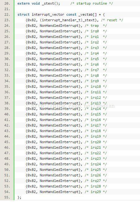 在使用STVD软件开发stm8sMCU时,打开STVD软件,系统自动生成中断向量文件vector.c。其中可以看到如下的代码