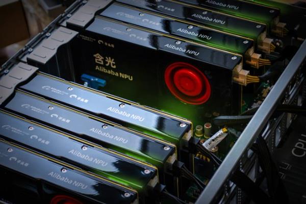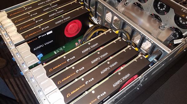 可以看到这些加速卡上有AliNPU Vision的logo,除了没有视频输出接口,看上去就跟显卡差不多——当然,GPU芯片的AI加速器通常也是这个样子的,不需要视频输出。