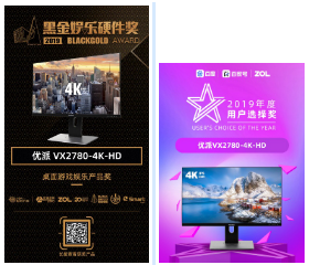 而具有 4K(3840 x 2160)级别的屏幕分辨率,27 英寸 IPS 屏幕的优派 VX2780-4K-HD,凭借优异的画质色彩表现和细腻的视觉效果呈现,荣获了中关村在线的“黑金娱乐硬件大奖(BlackGold)”以及“2019 年度用户选择奖”。