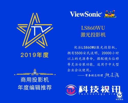 在商用产品领域, 5500ANSI 流明,可达 20000 小时以上光源寿命的优派商用激光投影机 LS860WU,经过科技视讯在多维度的综合评选后,获得“商用投影机年度编辑推荐奖”。