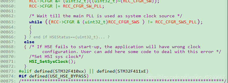 由于系统设置时钟源是在系统起来厚,main函数之前设置的,在SetSysClock(),首先需要自己设置HSI为系统时钟源,代码如下: