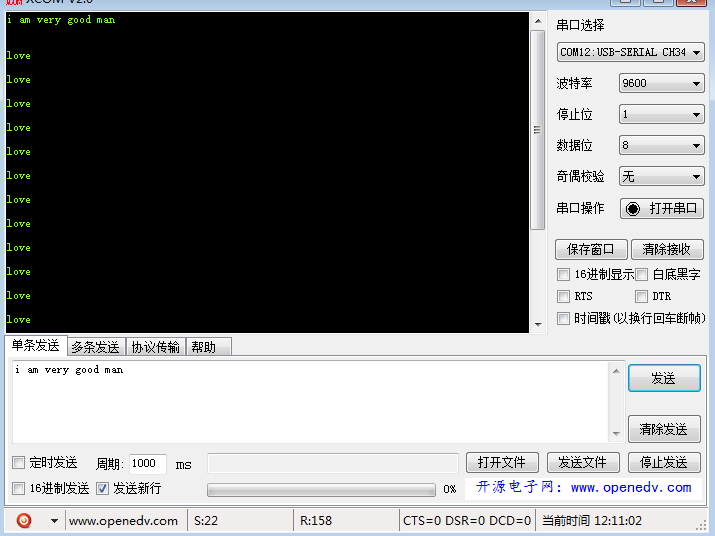 for(i=0;i USART1->DR=USART_RX_BUF[i]; while((USART1->SR&0X40)==0);//等待发送结束 } printf("rnrn"); USART_RX_STA=0; } else//不接收数据时 { ++times; if(times%5000==0)printf("rnlovern"); if(times%30==0)LED0=!LED0; delay_ms(10); } } } 可能上面的代码有点看不懂,我们翻到usart.c 里面有这么一段代码 //串口1中断服务程序 //注意,读取USARTx->SR能避免莫名其妙的错误 u8 USART_RX_BUF[USART_REC_LEN]; //接收缓冲,最大USART_REC_LEN个字节. //接收状态 //bit15, 接收完成标志 //bit14, 接收到0x0d //bit13~0, 接收到的有效字节数目 u16 USART_RX_STA=0; //接收状态标记 0x8000对应的2进制 100000000000000 0x3fff 对应的2进制 0011111111111111 这样就很明显了。。(感觉离底层越来越远了) 将程序烧进去之后打开串口调试助手 界面显示如下: 还会看到LED一直闪烁。。说明程序应该没问题
