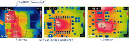 特别地,该方案PoE级的电源转换能效达99.2%,几个主要器件的红外热像图如图3所示,测试条件为PD端第8级71.3 W功率,PD 输入的最低电压和最高电流为41.1 VDC和 1.73 A,我们可看到在热平衡的状态下,整个板的最高温度不超过53 ℃,无需额外的散热处理。