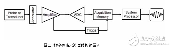 第一代数字示波器现在被称为数字存储示波器(DSO),使用串行的工作结构。原理框图如下:
