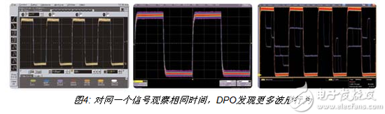 DPO数字荧光示波器的并行结构从根本上解决了DSO数字存储示波器波形捕获率低、波形漏失严重的缺陷。DPO7000、DPO70000系列实时数字荧光示波器的波形捕获率可以达到250000wfm/s,DPO71000、DPO72000系列超高性能数字荧光示波器更可超过300000wfm/s,捕获波形占总体信号的比例也最高可达60%(连续提供);而且新一代的DPX采集也没有了上一代“准实时荧光示波器” 的最高1.25G实时采样率的限制,而是可以工作在任何采样率下,对信号的捕获能力进一步增强,是现在业界发现问题的最佳工具。下图是三家不同厂商的同等级示波器同时观测一个带有偶发故障(约一秒钟发生一次)的时钟,15秒以后的情况。可以看到,在前面两种示波器几乎没有发现任何问题的时候,泰克的数字荧光示波器(右图)却捕获到了此间发生的多次故障,差别一目了然。
