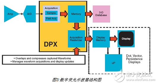 在这个方面,泰克公司走在了行业的最前面,从一开始就着手于串行构架的改造。从上世纪90年代中期的InstaVu?到2006年初的实时DPO,基于并行构架的第三代示波器:数字荧光示波器,从出现逐渐走向成熟。下图是DPO数字荧光示波器的结构图:
