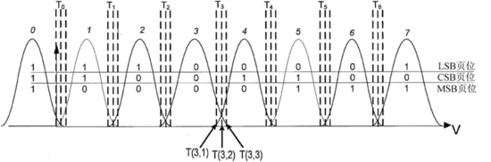 图1是用于BER估计的三位每单元(bpc)快闪存储器装置的电压阈值分布示意图。通常来讲,NAND单元重复的编程和擦除会致使电荷在存储器单元中被捕获,这些电荷可减少单元编程时间,且可在编程和读取过程中引入错误,导致NAND快闪装置的位错误率(BER)增大。此专利提出,针对每一电压阈值设置三个相关的检验阈值,邻近检验阈值之间的差值可为约50mV到100mV,并根据恰好在编程之后(这时估计BER)的每一程序等级的预期电压阈值分布配置阈值差,利用这种增加每状态检验电压阈值的数目来改进所估计的BER的准确性。