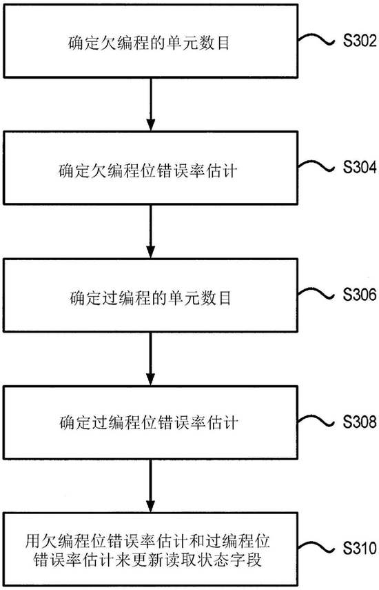 图2是在图1基础上用于估计NAND快闪装置BER的具体方法,采用编程-检验逻辑执行,以在一或多个块的编程期间估计NAND快闪装置内的一或多个块的BER。首先步骤S302中确定与电压阈值相关联的欠编程单元数目,如图1所示,由于每状态有三个检验阈值状态,当单元被编程有第四状态时,内部逻辑可确定具有低于阈值电压的单元数目。在步骤S304中确定针对每一电压阈值的欠编程BER估计值passTHBER。接着在步骤S306中确定欠编程的单元的数目,具体表现为将块内每一单元处的电压电平与三个指定检验阈值水平进行比较,以确定具有高于这些阈值中的每一者的电压值的单元的数目。在步骤308中确定过编程的的BER估计,其值为与所有其它电压阈值相关联的BER值的最大值。最后在步骤S310中用所估计的欠编程的和过编程的BER估计来更新读取状态字段,并读取状态寄存器输出BER估计,并在寄存器中做指示。