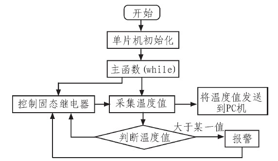 本系统由温度采集模块,固态继电器控制模块,单片机模块,PC机软件处理模块。4个模块加起来实现温度的控制,以及温度采集和温度经过软件处理的分析。它们的逻辑关系如图1所示。