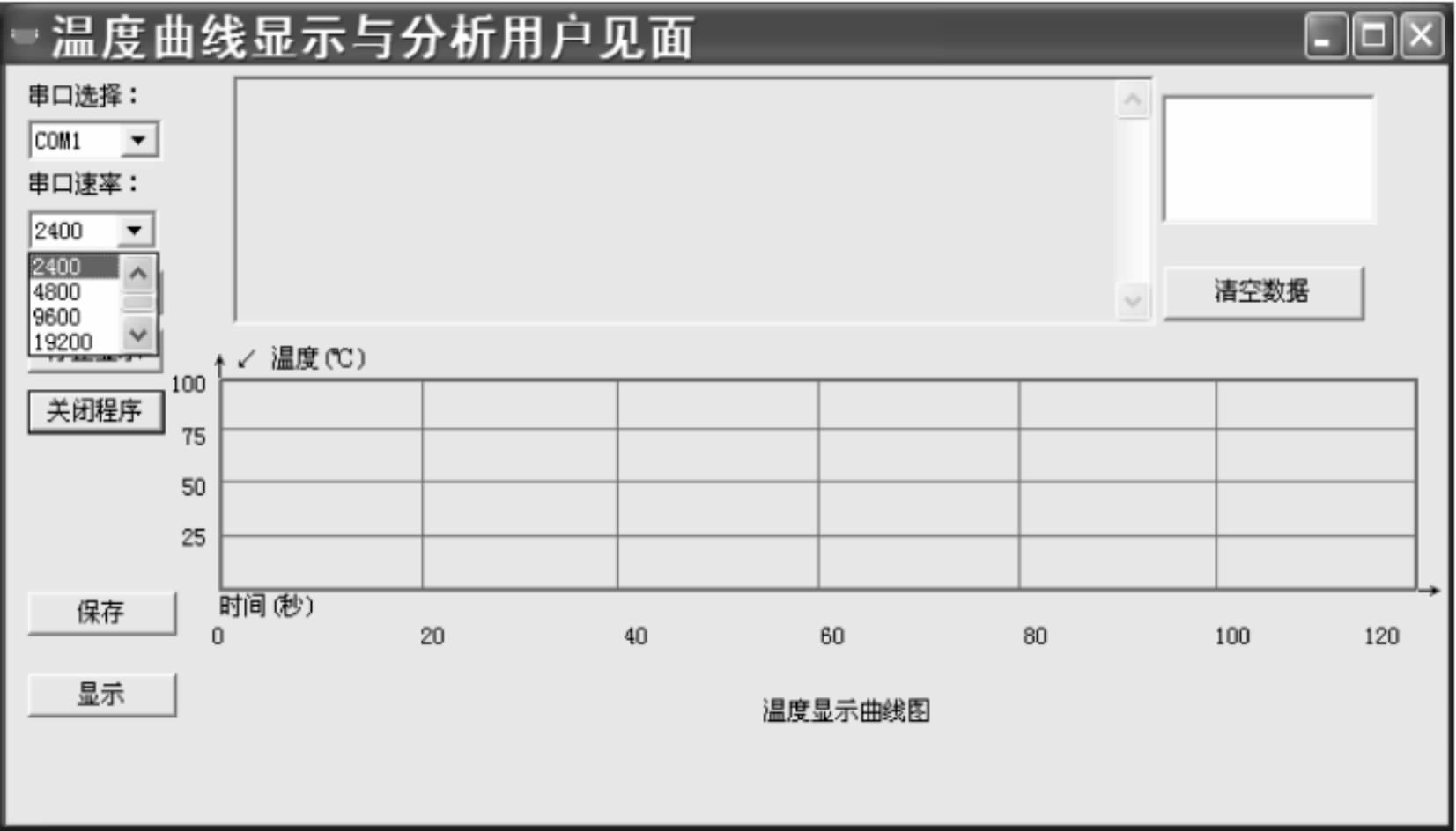 通过单片将数据传递给PC机,PC机将接收到的数据在温度曲线显示与分析用户见面显示出来。本软件设计中还有串口选择、波特率的选择、停止显示、清空数据、关闭程序等基本功能。这里主要是温度值的曲线绘制,然后再将温度值保存起来并进行再显示的操作。从而达到实时采集与分析的功能。温度曲线显示与分析用户界面如图4所示。