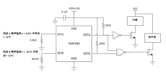 图2:TMP390在+ 60°C和-40°C阈值下具有10°C磁滞的示例电路