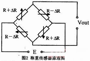 电阻应变式称重传感器是把电阻应变计粘贴在弹性敏感元件上,然后以适当方式组成电桥的一种将力(重量)转换成电信号的传感器。在电阻应变式称重传感器中通过桥式电路将电阻的变化转换为电压变化。电阻应变式称重传感器工作原理如图2所示。本设计选用湖南宇航公司的SB-B型悬臂式称重传感器,额定量程5kg,灵敏度3mv/V,非线性误差0.03%ES,重复性误差0.02%ES,蠕变(30分钟)O.03%F.S,零点温度漂移0.03%F.S./10℃,温度补偿范围-10~60℃。该系列传感器采用悬臂单剪切结构,过载能力强,受力后自动调心好,具有精度高、长期稳定性好、抗疲劳、抗偏载能力强的特点。