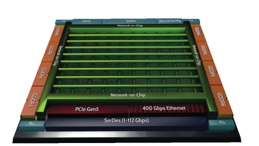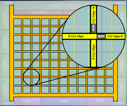 Achronix 最新基于台积电(TSMC)的7nm FinFET工艺的Speedster7t FPGA器件包含了革命性的新型二维片上网络(2D NoC)。2D NoC如同在FPGA可编程逻辑结构上运行的高速公路网络一样,为FPGA外部高速接口和内部可编程逻辑的数据传输提供了超高带宽(~27Tbps)。