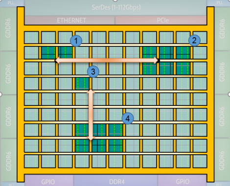 NoC使用一系列高速的行和列网络通路在整个FPGA内部分发数据,从而在整个FPGA结构中以水平和垂直方式分发数据流量。NoC中的每一行或每一列都有两个256位的、单向的、行业标准的AXI通道,可以在每个方向上以512Gbps(256bit x 2GHz)的传输速率运行。