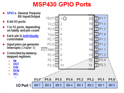 不同型号的MSP430可以提供一个或者多个8位I/O口。一般来说引脚越多的芯片提供的I/O口也越多。每8位I/O口会被分为一组(port),在每组当中再给每位编号(bit)。例如Port1中的第一位I/O口就命名为P1.0。