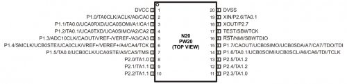 例如下图中,MSP430G2553的引脚8,它既可以作为GPIO模块中的P2.0,也可以作为定时器的TA1.0端口。其他引脚也是类似。具体每一个引脚有哪些功能请见MSP430G2553的datasheet。