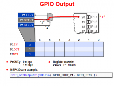 利用方向寄存器将I/O口配置为输出以后,就可以通过写输出寄存器PxOUT来给端口赋值了。例如要将P1.7设为高电平,直接写
