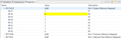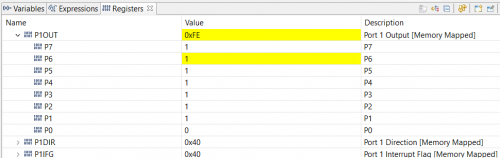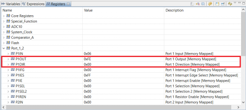 下面我们打开寄存器查看窗口,来看一下P1DIR和P1OUT寄存器的值。在CCS Debug界面下,右上方应该会有寄存器查看窗口(Registers),如果没有可以通过View->Registers菜单打开。Registers窗口中可以看到所有的寄存器,展开Port_1_2可以找到P1DIR和P1OUT两个寄存器。