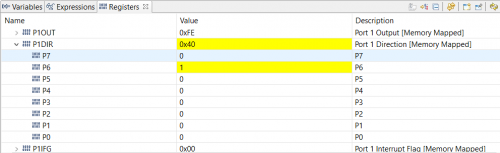 此时程序还未执行这一句,再点击一下Step Over按钮,程序就将执行该语句。点击Step Over之后请观察Registers窗口,我们会发现P1DIR寄存器变成了黄色,这表示刚才执行的语句使P1DIR发生了变化。展开P1DIR,会发现其中第6位即P1.6从0变成了1,这表示我们已经成功将P1.6端口设成了输出端口。