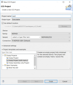 新建一个CCS工程,芯片型号选择MSP430G2553,工程模板选择EmptyProject(with main.c)