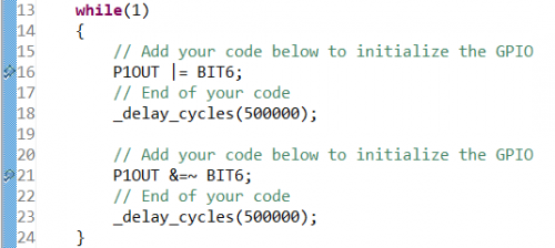 将程序编译并下载到LaunchPad中开始运行,LED是否按照预期开始闪烁了呢?如果没有也不用着急,下面我们将介绍如何在CCS中利用断点和单步调试功能对一个程序进行调试。在此之前请参考本实验的solution代码,该代码是本实验的示例代码。