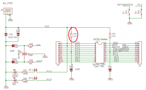 将Lab2b_Input.txt中的代码拷贝到main.c中。首先要添加的是GPIO初始化代码,请回想2.2节的内容,对输入引脚做初始化时需要考虑上拉/下拉电阻的设定。查看“MSP-EXP430G2 LaunchPad Development Kit User's Guide”手册,其中有LaunchPad的原理图,我们发现S2按键连接的P1.3端口连接了R34上拉电阻,但请注意LaunchPad板上的R34并没有焊接,所以P1.3端口相当于悬空。因此我们必须使用单片机GPIO内部上拉电阻来初始化P1.3。在程序中初始化GPIO处添加合适的语句来初始化P1.3输入端口。